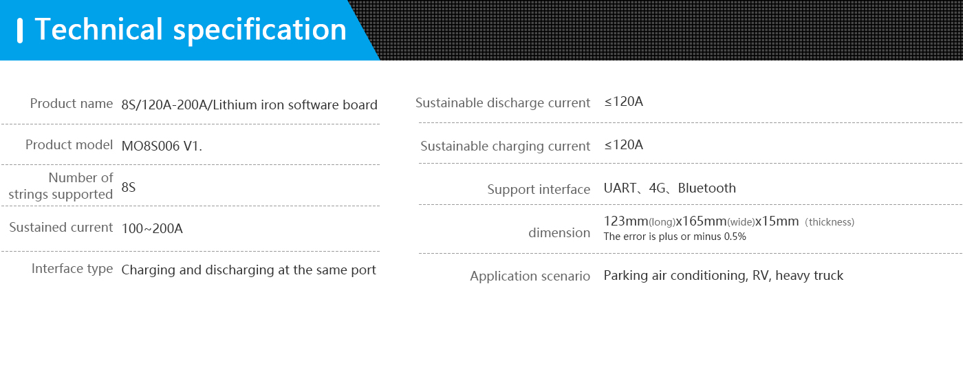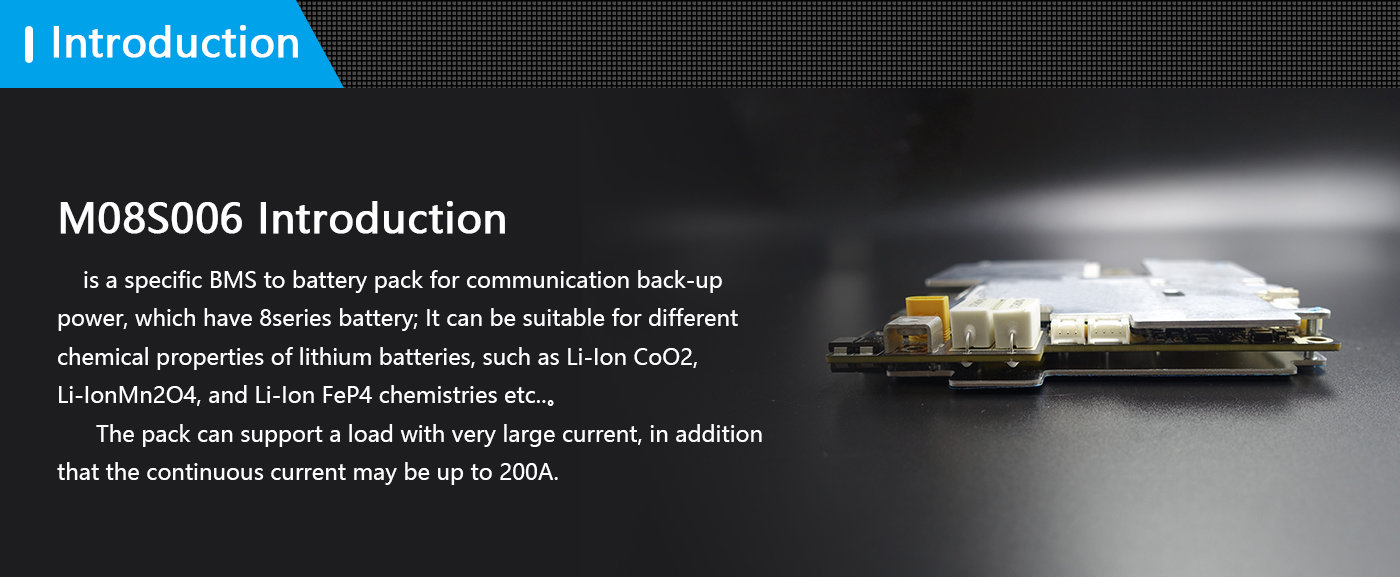 Hippo BP-M08S006 is a protection board solution specially designed by our company for 8-series power battery packs; it can be used for lithium batteries with different chemical properties, such as lithium ion, lithium polymer, lithium iron phosphate, etc. This protection board has a strong load capacity and the maximum continuous current can reach 200A