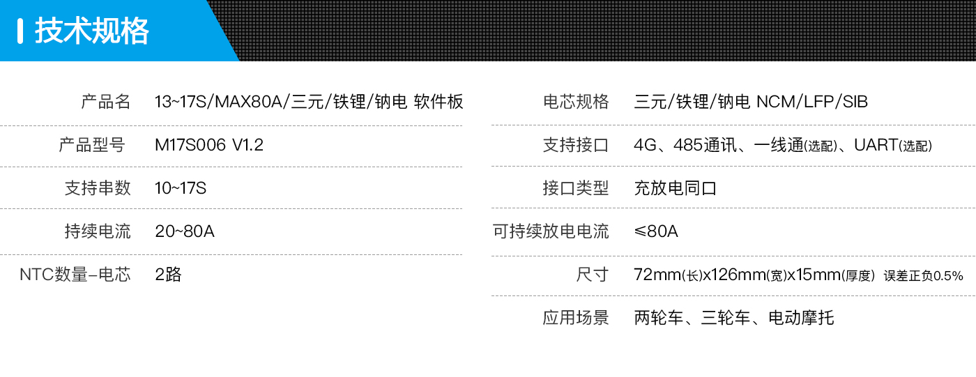 BP-M17S006 是我司專門針對動力電池13~17串電池包而設計的保護板方案;可適用不同化學性質(zhì)的鋰電芯,如鋰離子、鋰聚合物、磷酸鐵鋰等。此保護板帶載能力強,最大持續(xù)電流可達80A。